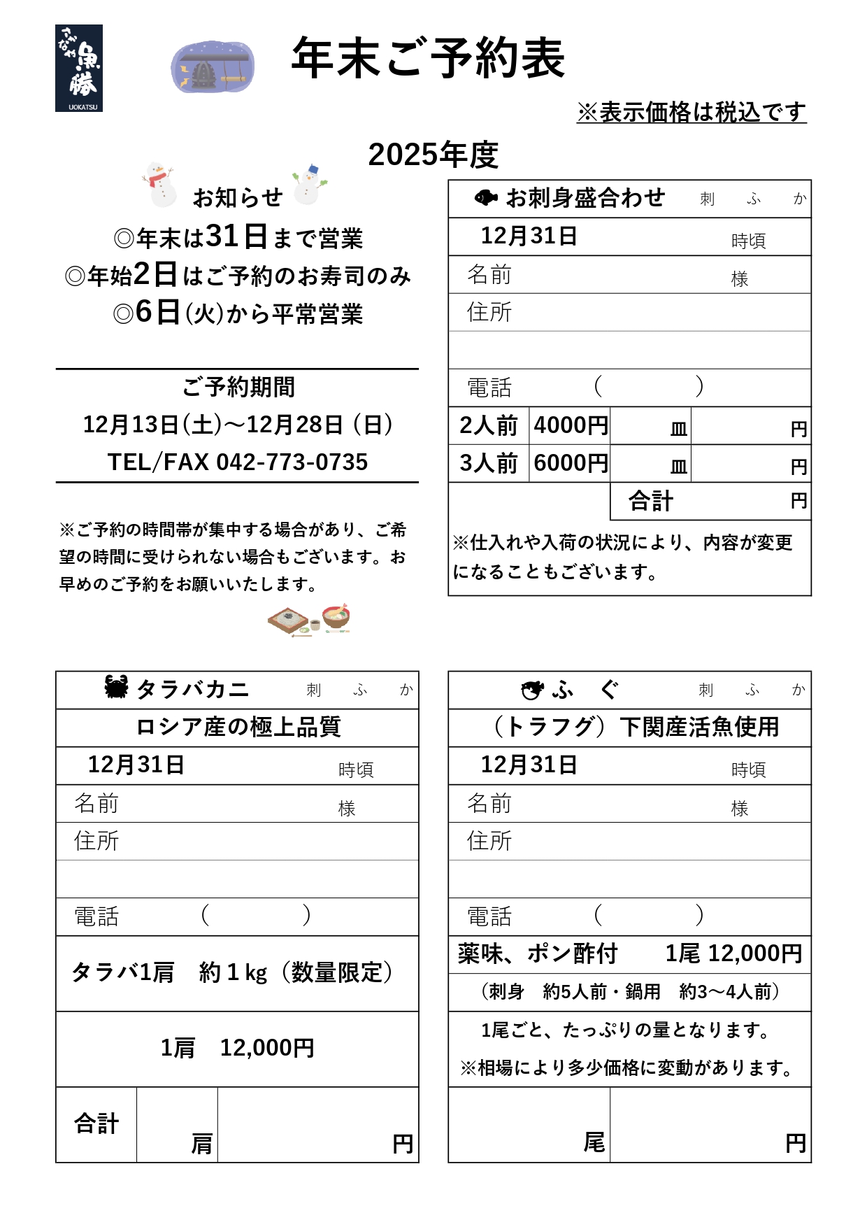 魚勝恒例、年末のご予約表ができあがりましたので、ご案内申し上げます。