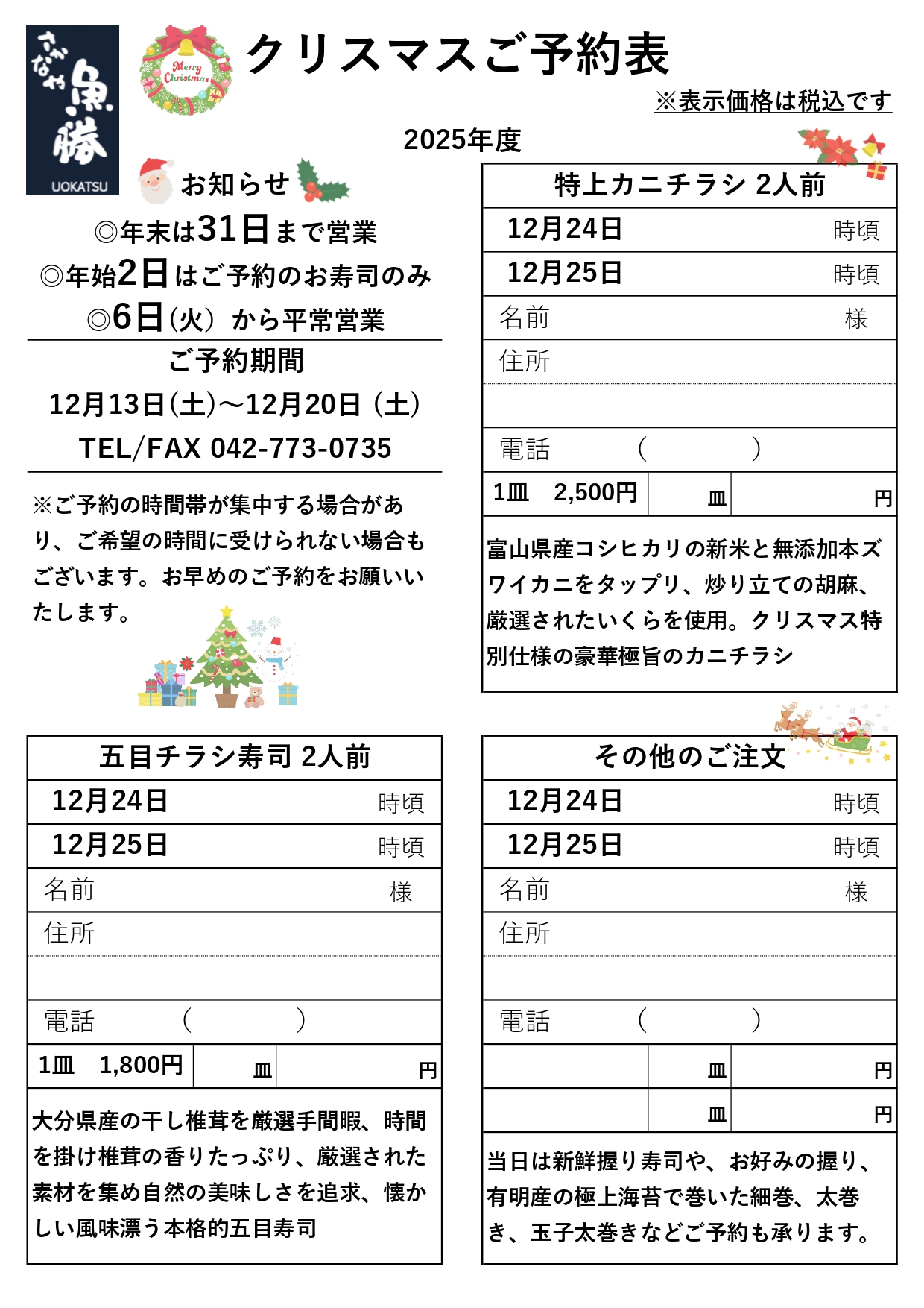 魚勝恒例、年末のご予約表ができあがりましたので、ご案内申し上げます。